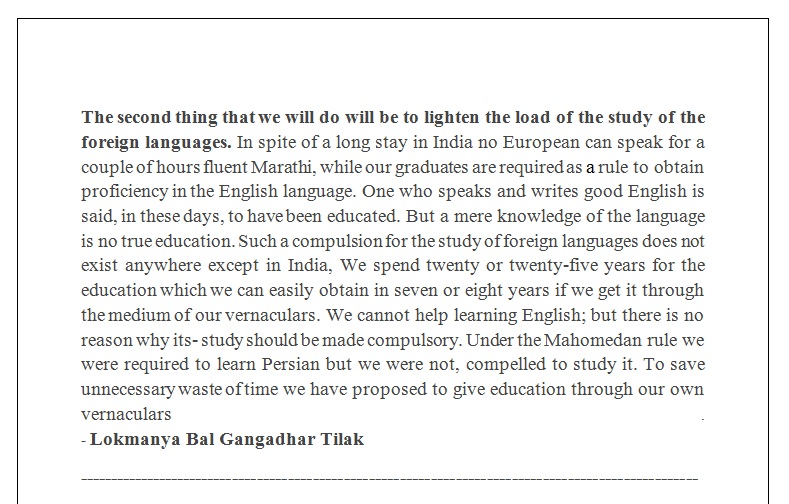 The second thing that we will do will be to lighten the load of the study of the foreign languages. In spite of a long stay in India no European can speak for a couple of hours fluent Marathi, while our graduates are required as a rule to obtain proficiency in the English language. One who speaks and writes good English is said, in these days, to have been educated. But a mere knowledge of the language is no true education. Such a compulsion for the study of foreign languages does not exist anywhere except in India, We spend twenty or twenty-five years for the education which we can easily obtain in seven or eight years if we get it through the medium of our vernaculars. We cannot help learning English; but there is no reason why its- study should be made compulsory. Under the Mahomedan rule we were required to learn Persian but we were not, compelled to study it. To save unnecessary waste of time we have proposed to give education through our own vernaculars.
