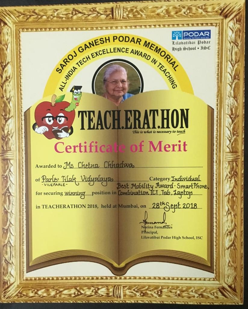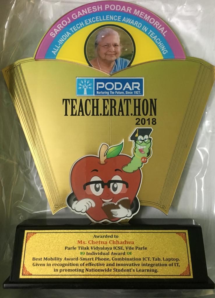 Ms. Chetna Chhadwa from Parle Tilak Vidyalaya ICSE won an individual Award in Teacherathon 2018 under the category, Best Mobility Award- ‘Smart Phone, Combination ICT, Tab, Laptop’ given in recognition of effective and innovative integration of IT, in promoting Nationwide Student’s Learning conducted by Saroj Ganesh Podar Memorial All –India Tech Excellence Award in Teaching.