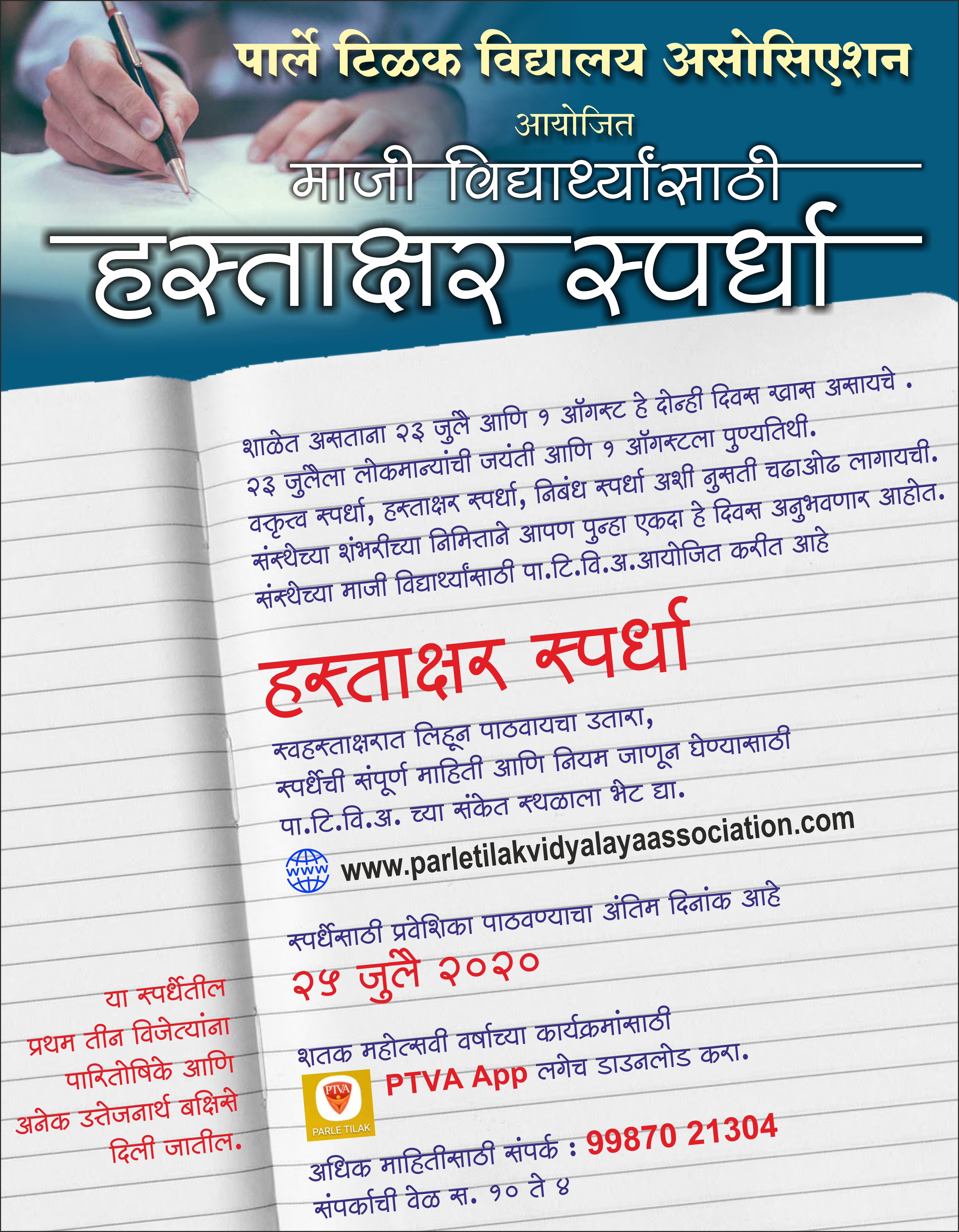 वक्तृत्त्व स्पर्धा, हस्ताक्षर स्पर्धा, निबंध स्पर्धा अशी नुसती चढाओढ लागायची. संस्थेच्या शंभरीच्या निमित्ताने आपण पुन्हा एकदा हे दिवस अनुभवणार आहोत. संस्थेच्या माजी विद्यार्थ्यांसाठी पा.टि.वि.अ.आयोजित करीत आहे हस्ताक्षर स्पर्धा.स्वहस्ताक्षरात लिहून पाठवायचा उतारा, स्पर्धेची संपूर्ण माहिती आणि नियम खालील प्रमाणे.