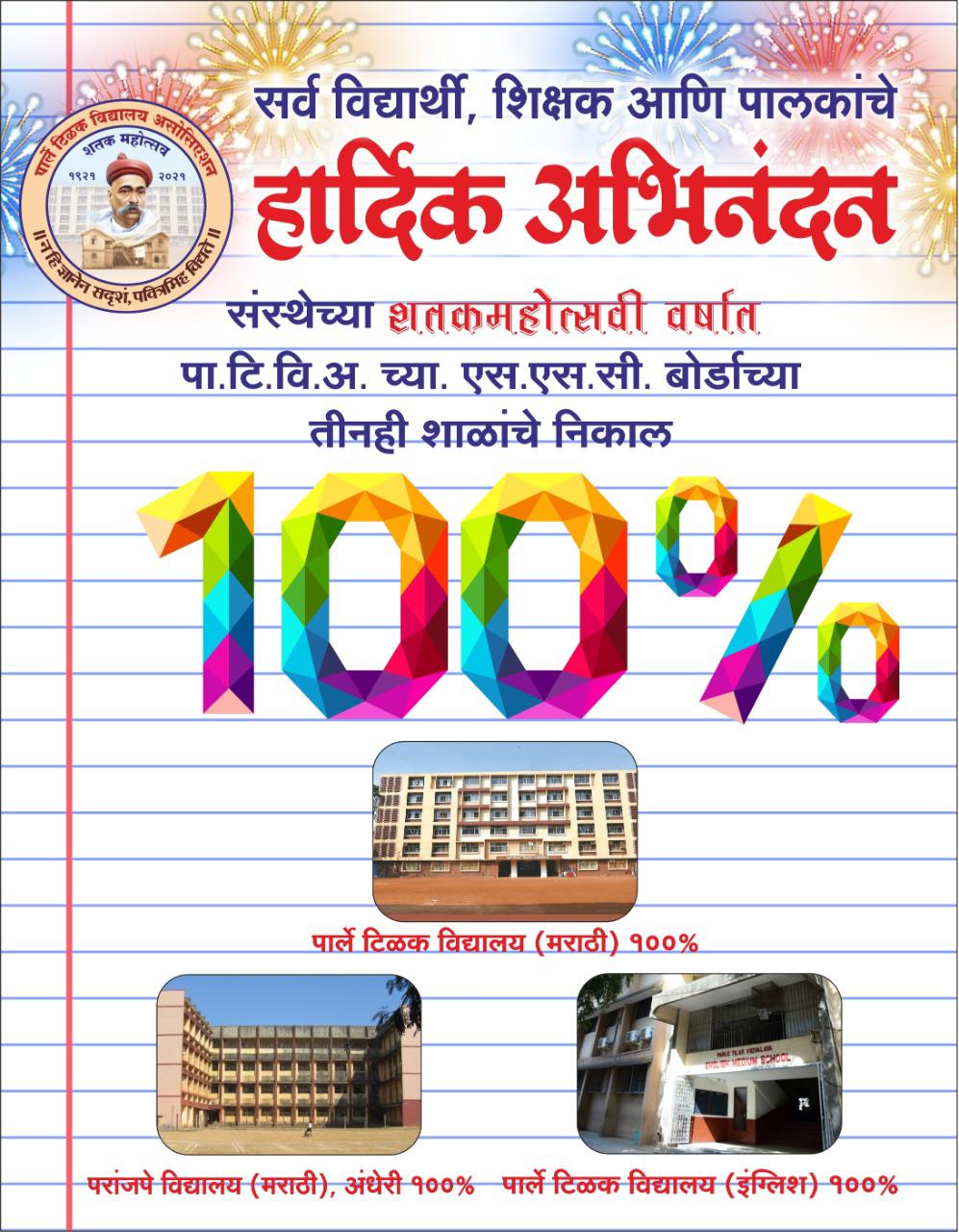 महाराष्ट्र राज्य माध्यमिक शिक्षण मंडळाच्या अर्थात इ.दहावी शालान्त परीक्षेचा आज निकाल जाहीर झाला. पा.टि.वि.अ. च्या तिन्ही शाळांचा निकाल १००% लागला. संस्थेच्या तसंच पा.टि.वि. मराठी शाळेच्या १००व्या वर्षात १००% निकाल !