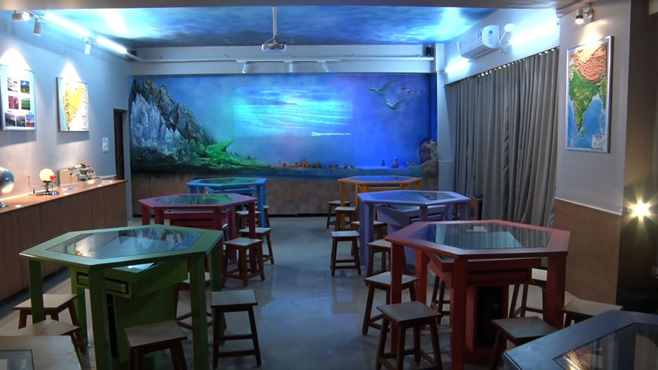 ह्या भूगोल दालनात पाऊल ठेवल्यावर खोलीतील आणि छतावरील रंगसंगती तुम्हाला नक्कीच आकर्षित करेल.संपूर्ण खगोलाचा नजारा , धूमकेतू ,आकाशगंगा तुमचे लक्ष वेधून घेतील.भिंतीवर लावलेल्या मोठ्या स्क्रीन वर तुम्ही त्या विषयाशी संबंधित माहितीपट पाहू शकाल.इथली प्रकाश योजना आणि ध्वनी योजनाही तुम्हाला एक वेगळा फील देईल.