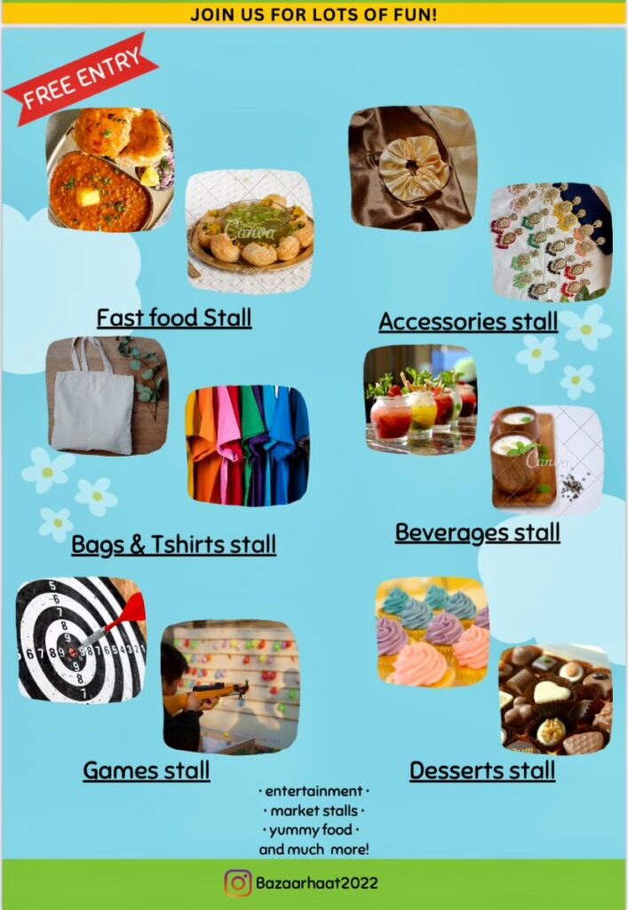 1.) Bazaarhaat is a students skill development programme that aims at inculcating business acumen and entrepreneurial skills in the students. Students set up a flea market that showcases an array of items ranging from food to accessories to clothing and various merchandise.
