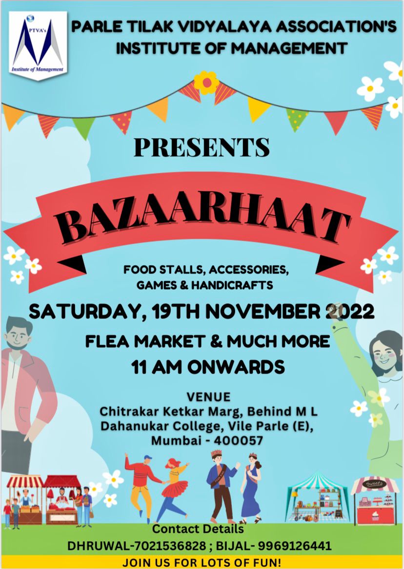 We cordially invite you to “BAZAARHAAT” a student skill development programme organized at “PTVA’S INSTITUTE OF MANAGEMENT” on “19th NOVEMBER 2022” from 11:00 am to 8:00 pm